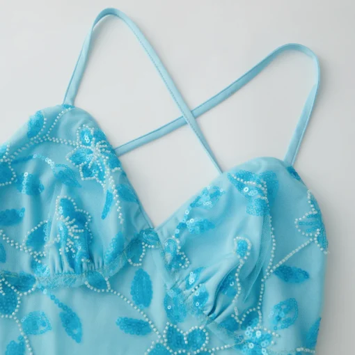 Women Slip Dress, Tie-up Spaghetti Straps Backless Sequins Beaded Flower Summer Mini Dress