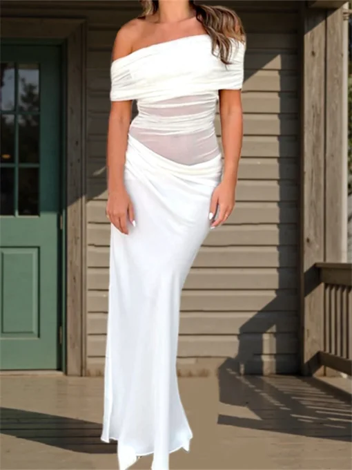 Women Long Dress Solid Color Boat Neck Off Shoulder Dress Summer Fashion Bodycon Dress